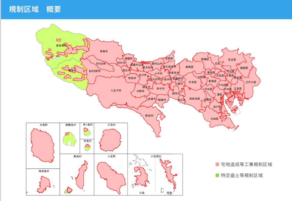 都のほぼ全域が宅造法規制区域又は盛土規制法規制区域のどちらかに指定されています。