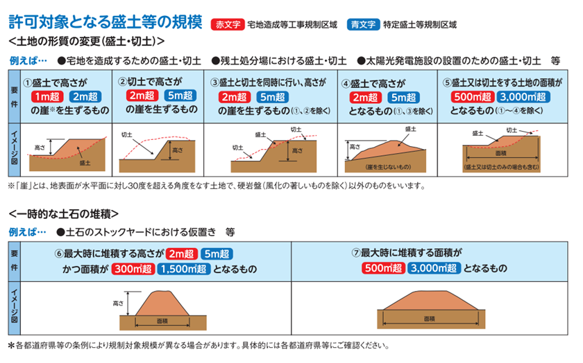 — | ① 盛土で高さ1m超の崖 ② 切土で高さ2m超の崖 ③ 盛土と切土を同時に行って、高さ2m超の崖(①、②を除く) ④ 盛土で高さ2m超(①、③を除く) ⑤ 盛土または切土の面積500㎡超(①〜④を除く) |