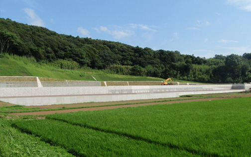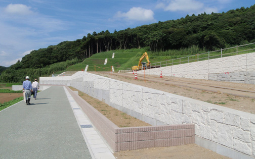 壁高が高いほどメリットの出やすいテールアルメ擁壁ですが、比較的低壁高の擁壁でも採用されています。斎場造成の施工例です。壁前面に植栽を計画しています。例えば、本来緑化が難しい直壁にツタ類を這わせることで、蝶などの生息環境や緑豊かな環境を創出できます。