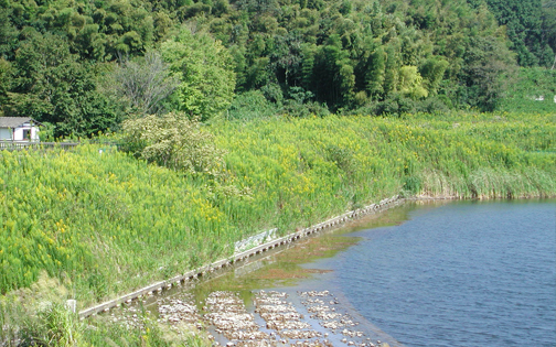 ブロック内は植生土のう、その上にぐり石を投入することで表面を植生で覆い、更にぐり石内に水生生物等が成育できるようになっています。