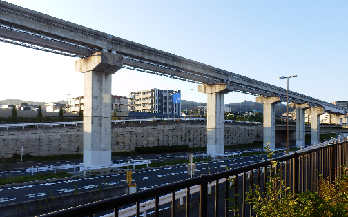 都市整備開発事業でのテールアルメ工事で、幹線道路である箕面丘陵線と大阪モノレール線を主軸とした道路計画沿いに採用された大規模なテールアルメ擁壁。当地区のコンセプトは「豊かな自然環境と快適な都市機能の調和」を目的とした町造りを基本としており、景観性を重視するためデザイン壁面材が採用された一例です。モノレールと新しい街づくりによく合ったデザインです。