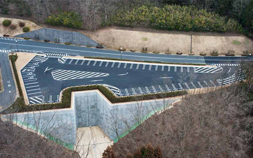 生死不二の福徳と栄光をしのぶ安らぎの場としてふさわしいこの墓地公園は、緑に囲まれ、野鳥の声が響き渡る山の中腹に立地しています。テールアルメ擁壁が、急峻な斜面を有効活用して、駐車場スペースを生み出しました。壁面の積石模様と独特な壁線形が、この施設の性格にマッチした荘厳な雰囲気を醸し出しています。