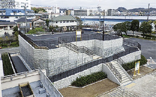 避難広場の高さは海抜6m。施設面積は約650平方メートルで、約300人を収容できます。耐震性に優れ、盛土の変形に追随する特徴が注目されテールアルメ擁壁が採用されました。階段に加え、車いす利用者らがスムーズに避難ができるよう整備されたスロープ構造もテールアルメ擁壁の構造がうまく活かされています。